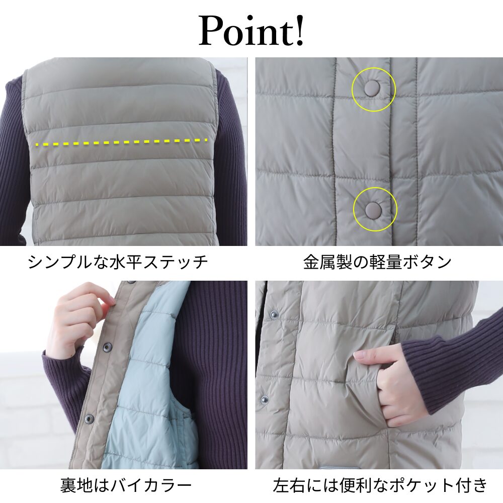 キーワード 【2025モデル発売!楽天1位獲得大人気ロングセラー】キルティング インナー ダウン ベスト レディース ミセスファッション アウター ライトダウン 軽い 襟なし 体型カバー 暖かい 30代40代50代60代 秋冬 プレゼント 誕生日 祖母 お祝い ゴルフ 登山 アウトドア ウォーキング imacoco イマココ シニアファッション 婦人服 送料無料 30代 40代 50代 60代 70代 トップス アウター ショート 長袖 9号 11号 M L Mサイズ Lサイズ ホワイト アイボリー グレー ターコイズ 春 秋 冬 春夏 秋冬 SS AW 秋ジャケット 冬ジャケット 防寒 寒さ対策 羽織り 体型カバー 体型隠し ゆったりシルエット 上品 高級感 大人ジャケット お出掛け着 贈り物 ギフト プレゼント ラッピング 母の日 誕生日 クリスマス 敬老の日 %OFF クーポン