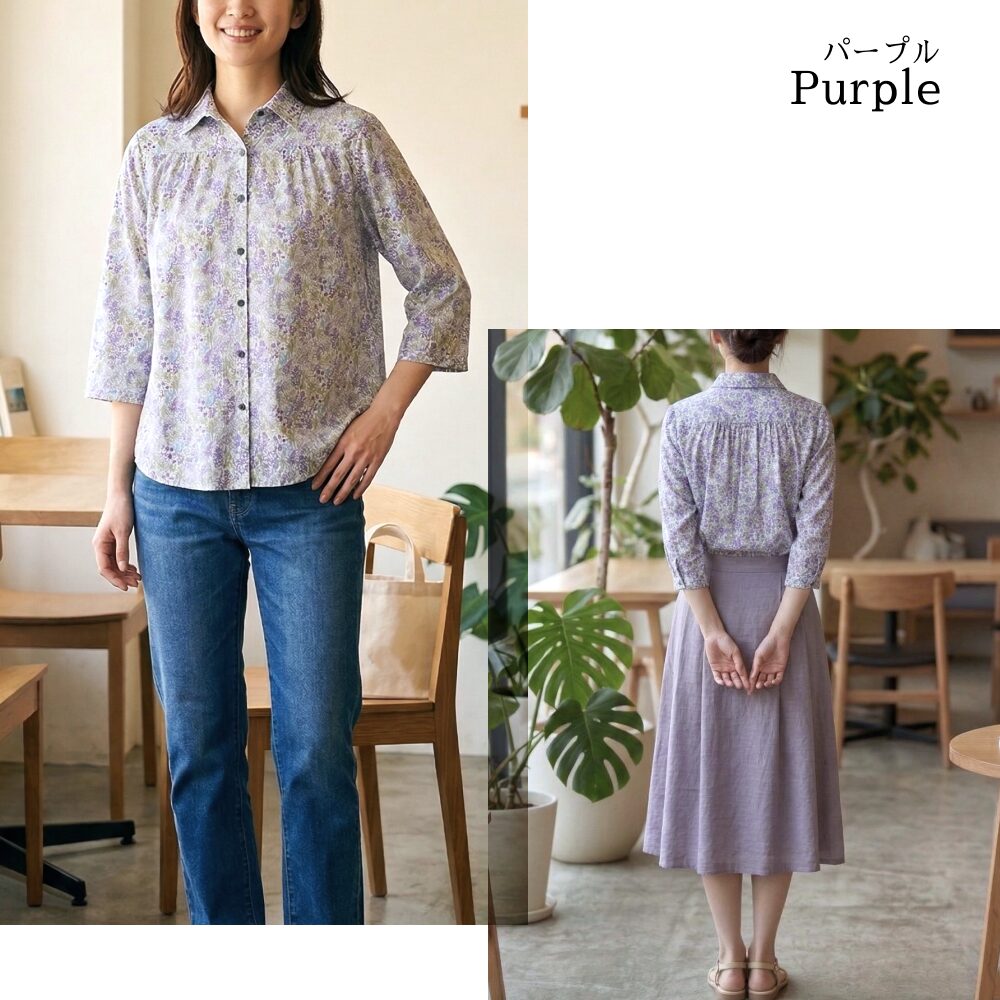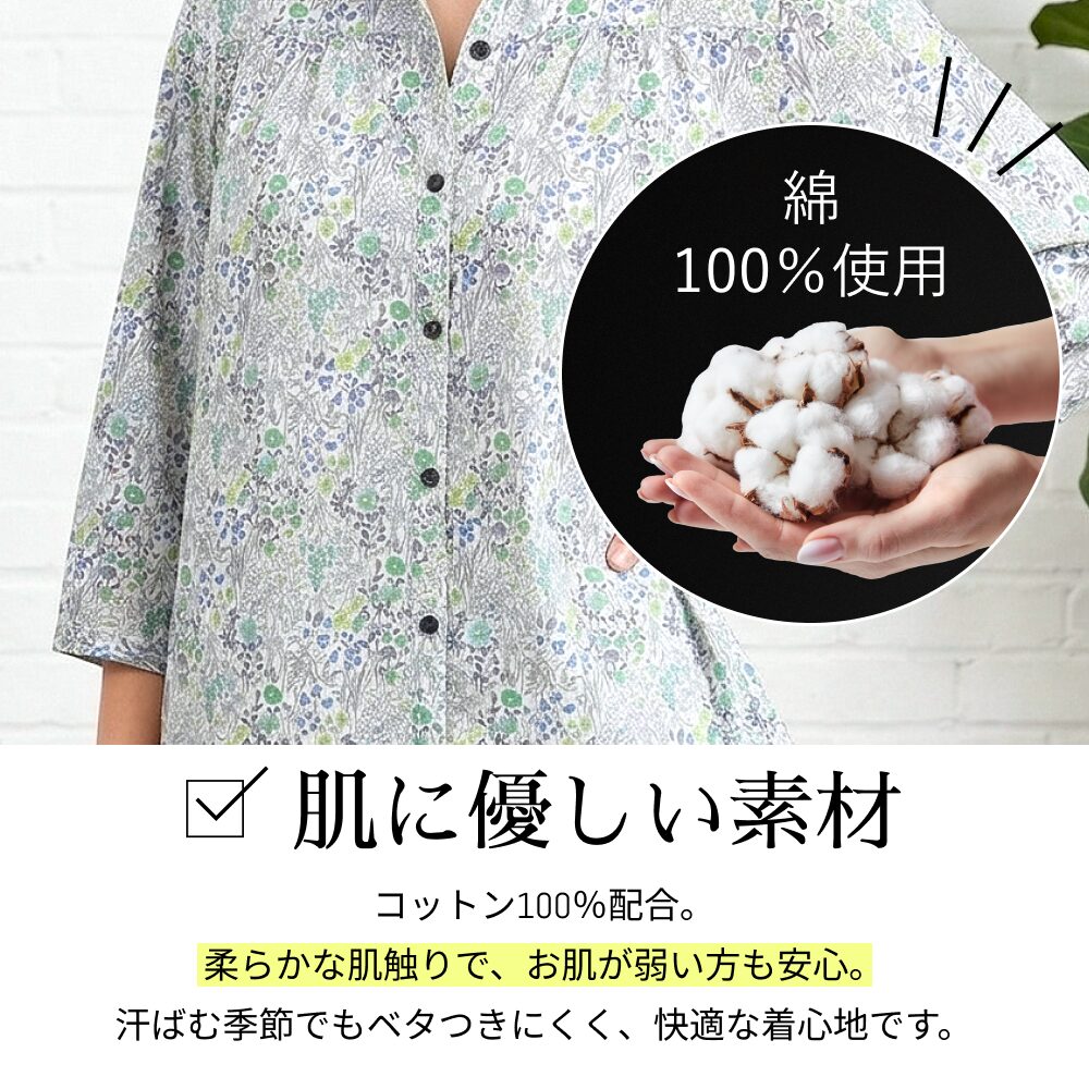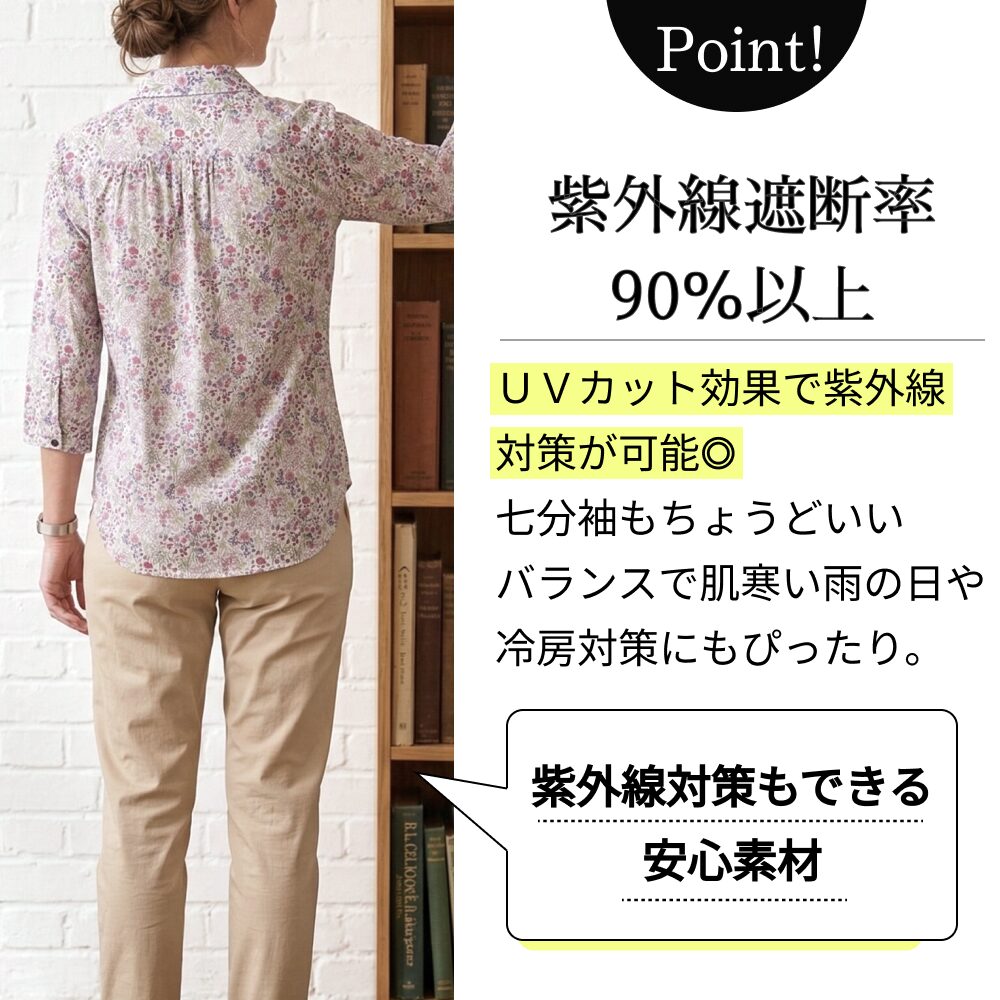 やさしく華やぐ小花柄ブラウスが今年も新登場!上品なデザインで大人の女性にぴったりの一枚です。 素材は綿100%でサラッと快適な着心地。紫外線遮蔽率90%以上(検査済み)で日差し対策も安心です。 七分袖で軽やかに着られ冷房対策にも◎ 胸元の切替デザインがふんわりとしたシルエットをつくり気になる体型も自然にカバーします。 前開き仕様で着脱も簡単!1枚でも羽織りとしても使える着回し力の高いブラウスです。