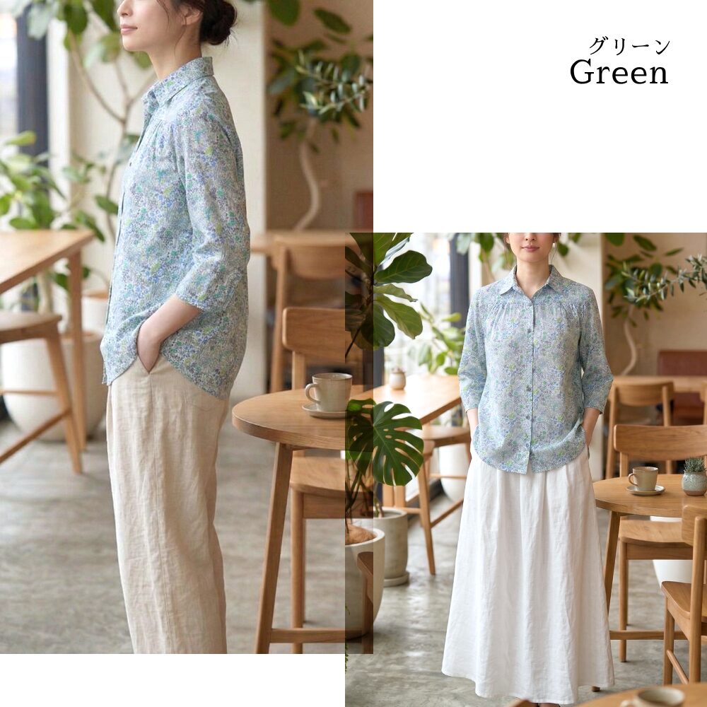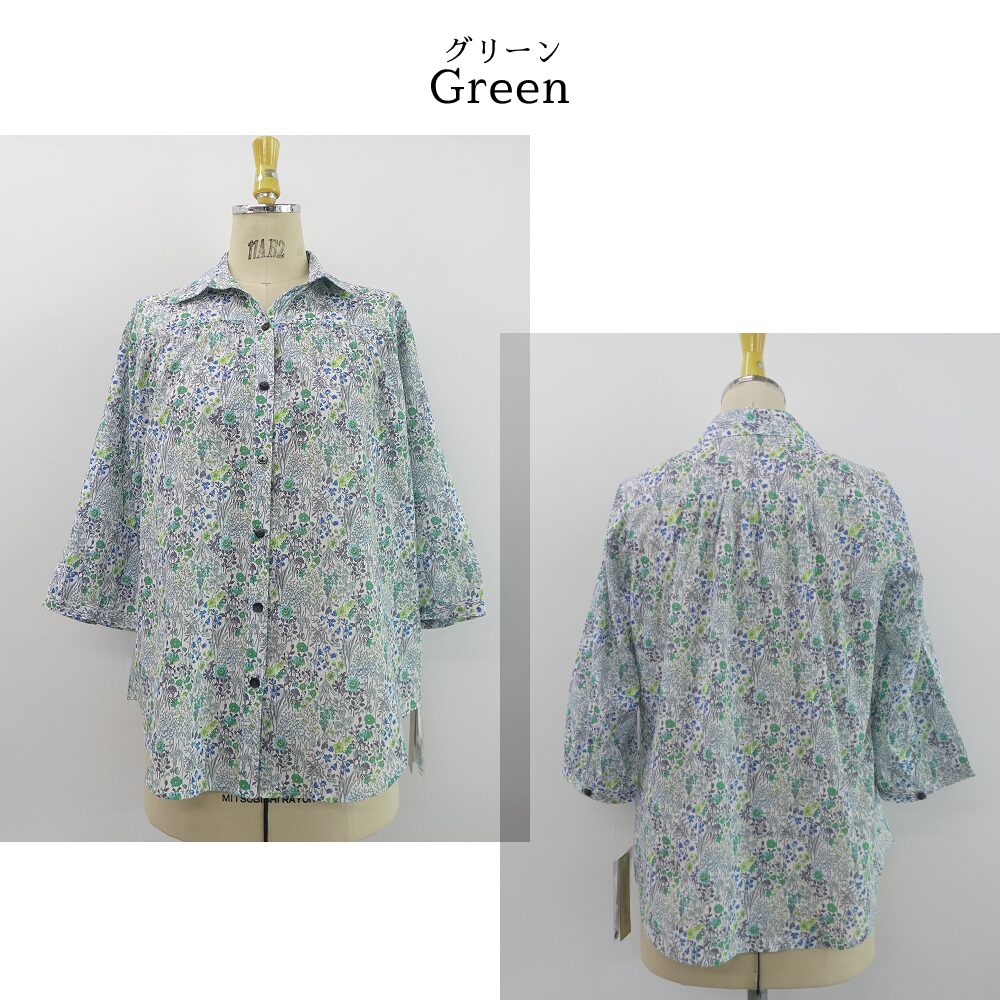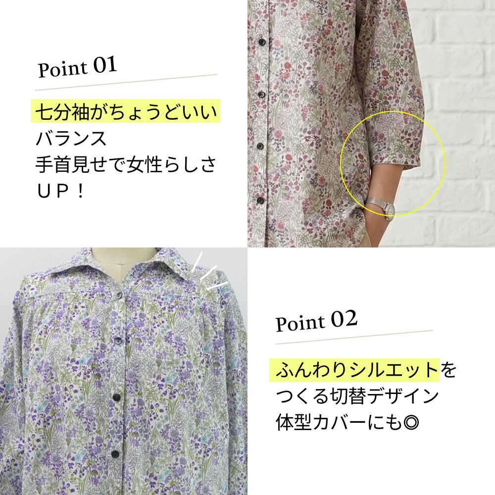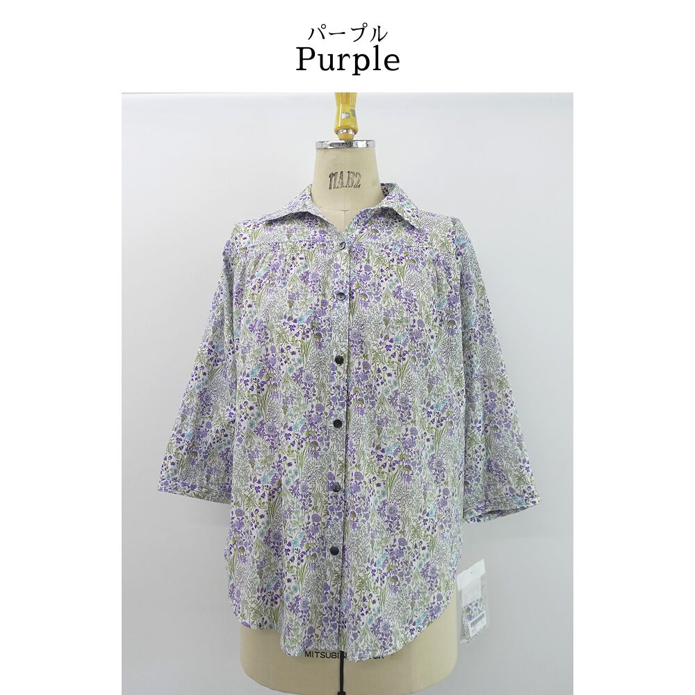 やさしく華やぐ小花柄ブラウスが今年も新登場!上品なデザインで大人の女性にぴったりの一枚です。 素材は綿100%でサラッと快適な着心地。紫外線遮蔽率90%以上(検査済み)で日差し対策も安心です。 七分袖で軽やかに着られ冷房対策にも◎ 胸元の切替デザインがふんわりとしたシルエットをつくり気になる体型も自然にカバーします。 前開き仕様で着脱も簡単!1枚でも羽織りとしても使える着回し力の高いブラウスです。